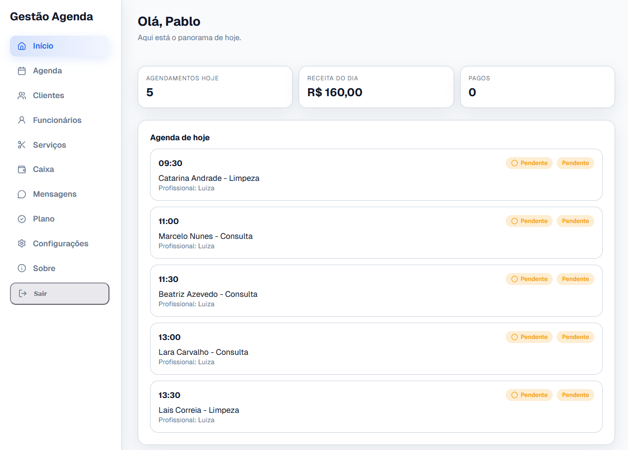 Centralize agenda, clientes e caixa em um painel simples. Pare de perder horários e saiba o que está entrando no dia.